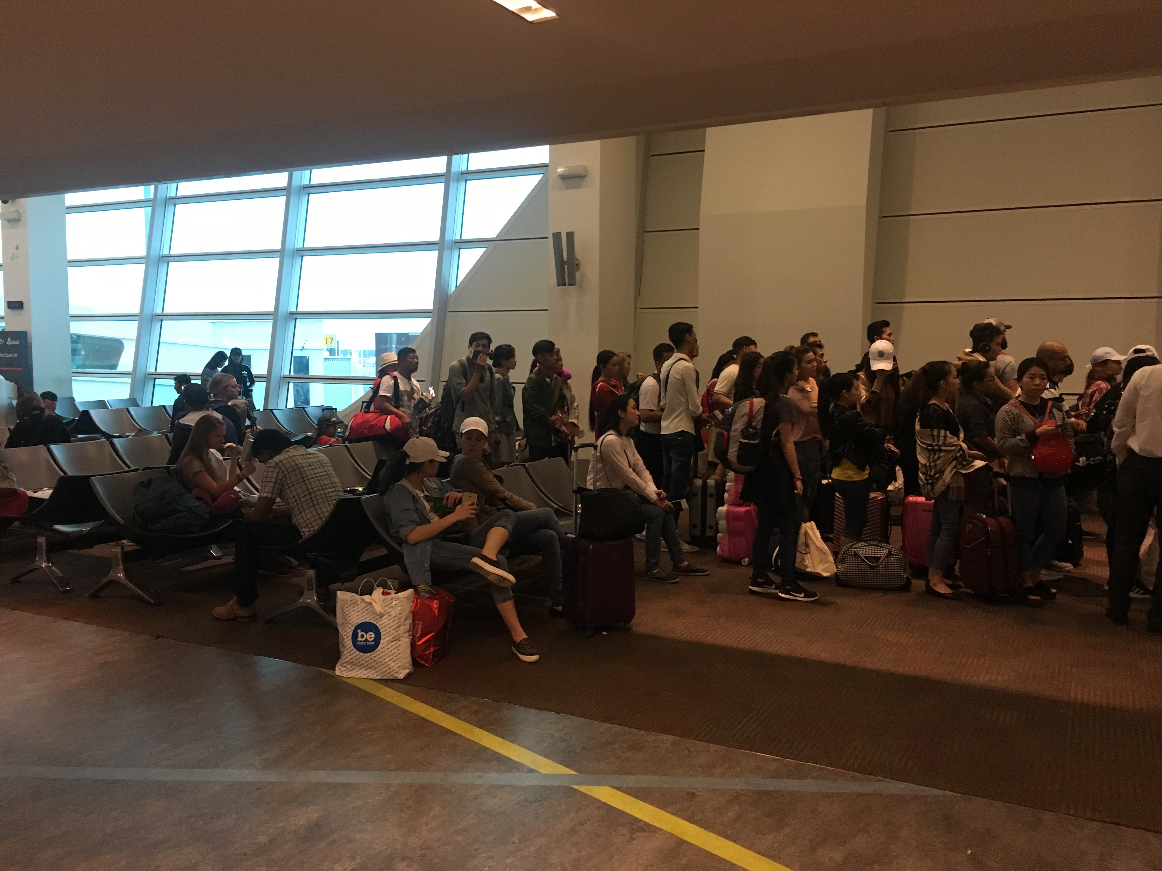 (↑クアラルンプールでトランジット中。混んでるし、飛行機も遅れてるし・・(困)。)